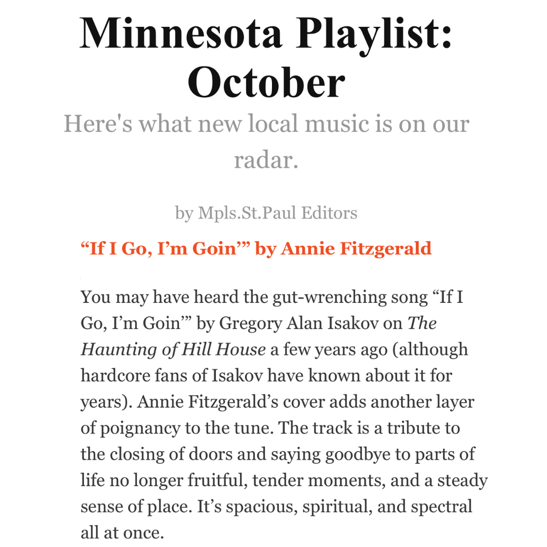 “If I Go, I’m Goin‘” made this list in this great company! Big love & thanks to Mpls St.Paul Magazine Editors! I’m always so grateful for the support and help getting the music to more hearts & ears. We’re really lucky in this city to have media outlets that shine lights on local artists. If you haven’t heard the single yet, there’s a whole playlist about it!